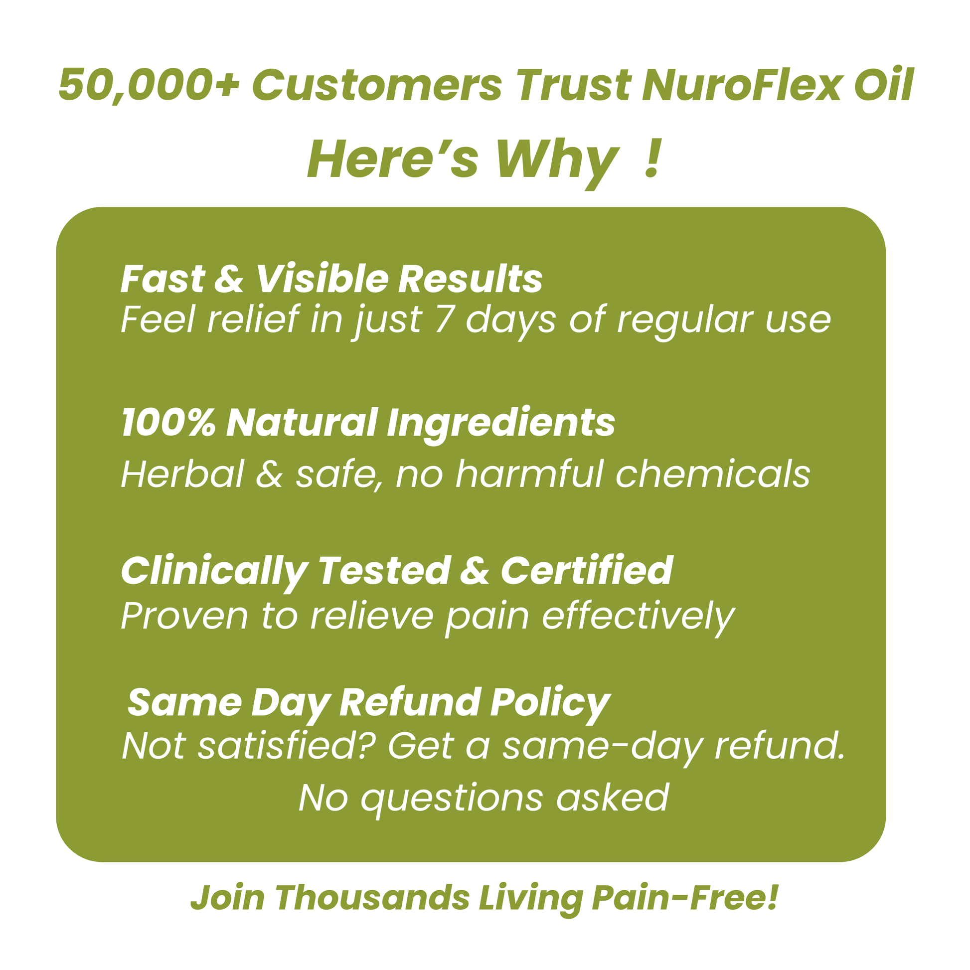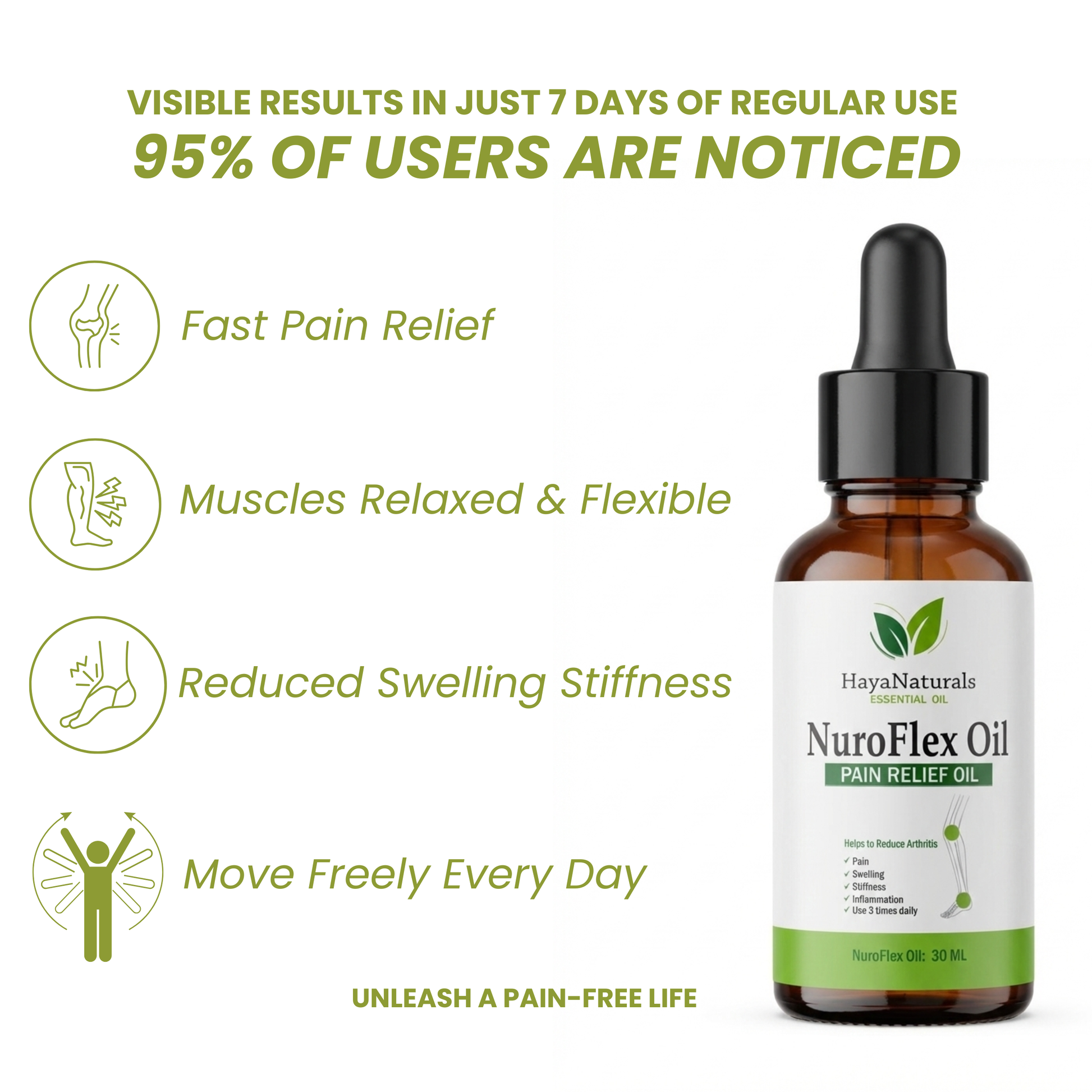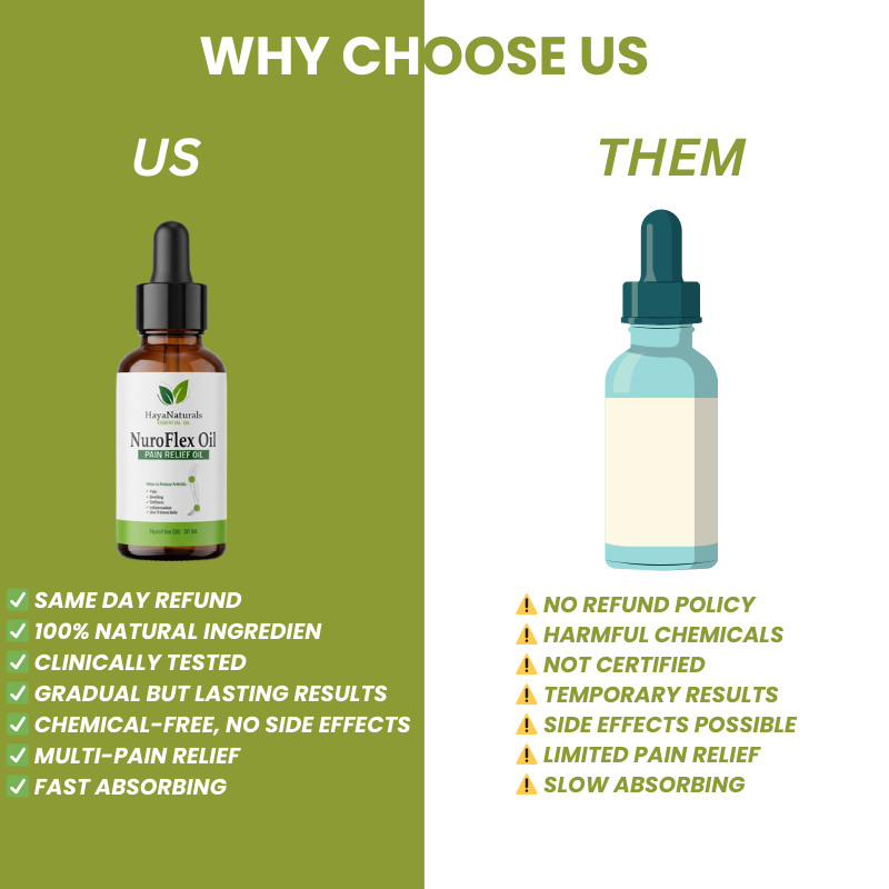 NuroFlex Oil is a natural pain relief oil formulated to help reduce joint pain, knee pain, stiffness, swelling, and muscle discomfort. It’s ideal for those suffering from arthritis, back pain, or muscle soreness.