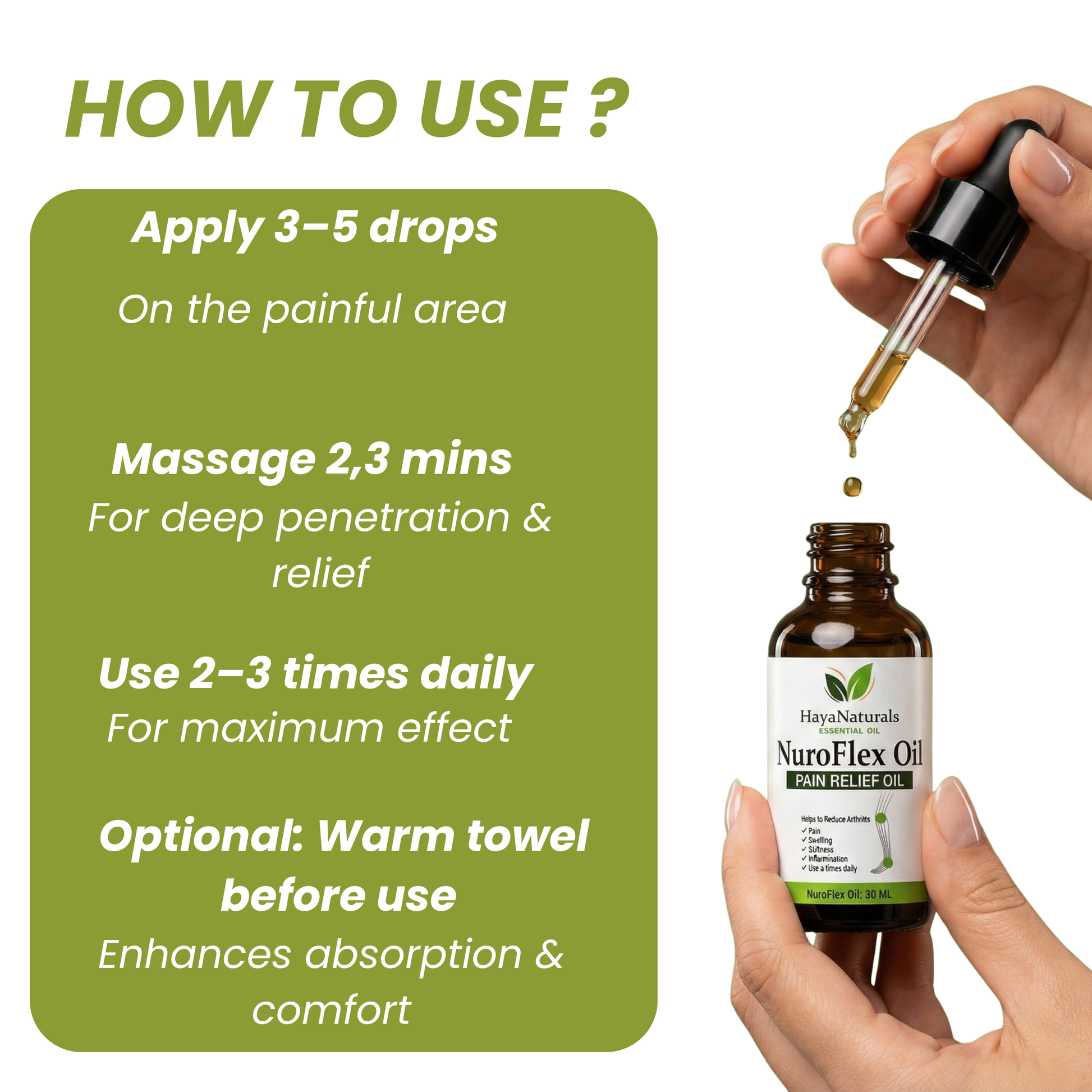 Apply 4–5 drops of Nuro Flex Oil on the affected area. Gently massage until fully absorbed.